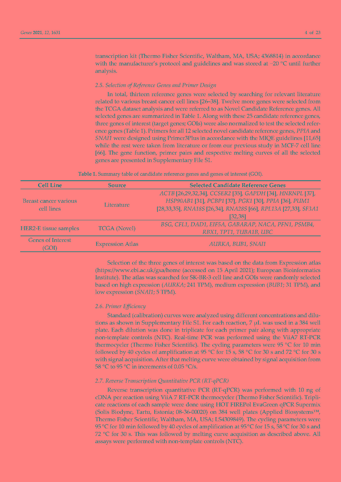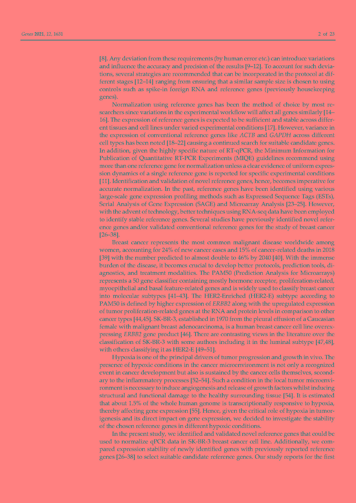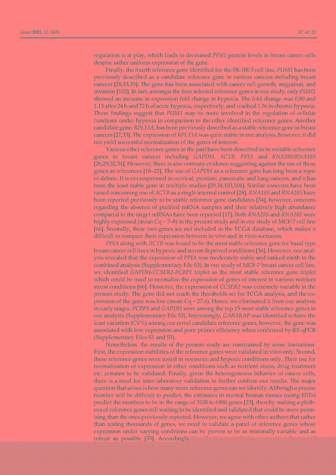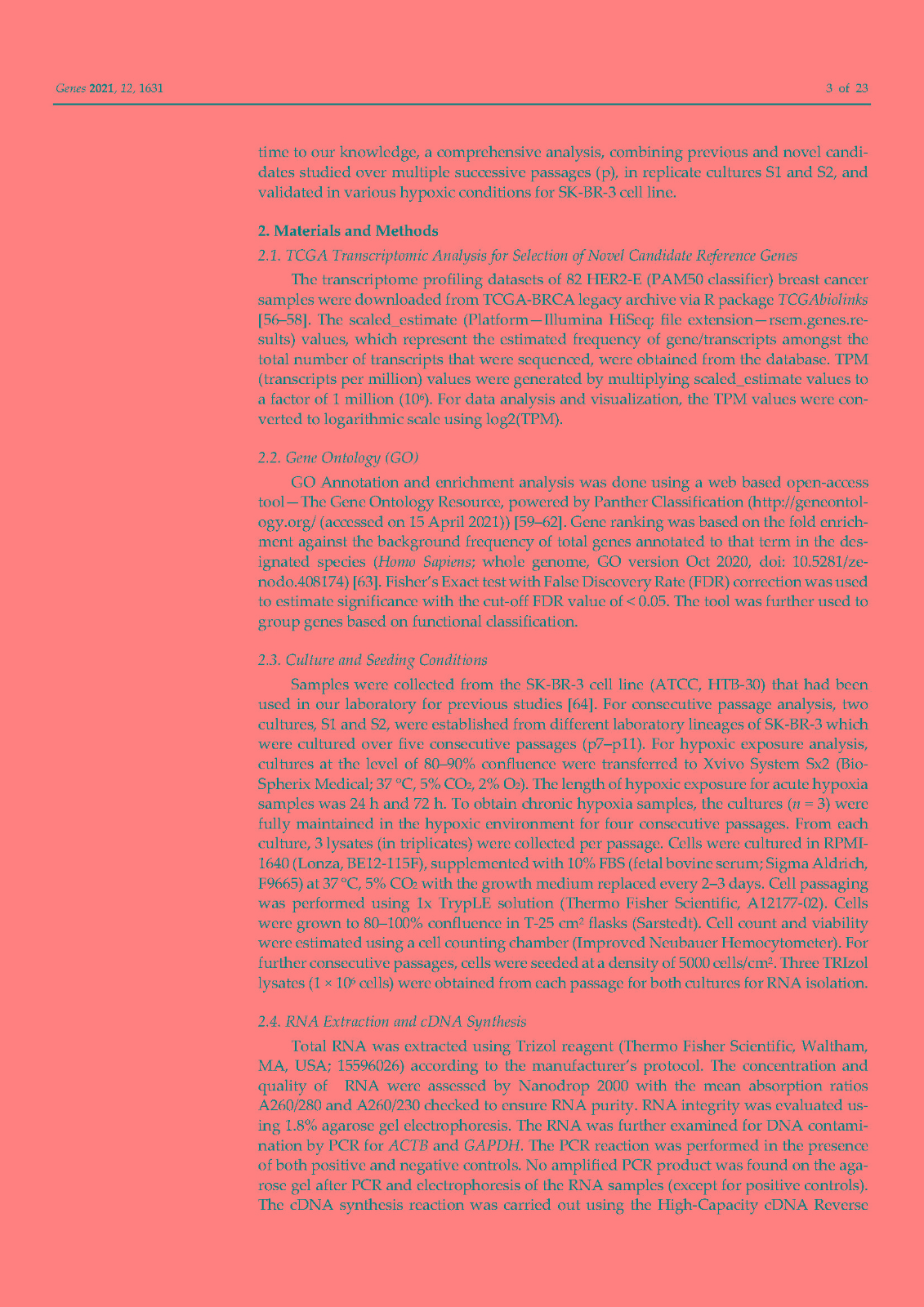使用内部对照或参考基因 (RG) 对基因表达进行标准化已成为标准化逆转录定量聚合酶链反应 (RT-qPCR) 技术变化的首选方法。传统上,ACTB和GAPDH尽管文献中的证据不鼓励使用它们,但已被用作参考基因。因此,在本研究中,我们在富含 HER2 的乳腺癌细胞系 SK-BR-3 中鉴定并研究了新的参考基因。对来自 TCGA 数据库的 82 个 HER2-E 乳腺癌样本的转录组数据进行了分析,以确定十二个具有稳定表达的新基因。此外,还分析了文献中的 13 个 RG。在两个平行培养物 S1 和 S2 中以及在急性和慢性缺氧条件下,使用各种算法研究了候选基因的表达变化超过 5 次连续传代 (p)。最后,选择最稳定的 RGs 并验证其在常氧和缺氧条件下三个感兴趣基因 (GOI) 的表达正?;N颐堑慕峁砻?span style="font-family:Calibri;">HSP90AB1、DAD1、PFN1和PUM1可用于三个(三联体)的任意组合,以优化 SK-BR-3 细胞系中检测内和检测间的基因表达差异。此外,我们不鼓励使用传统的 RG(ACTB、GAPDH、RPL13A、RNA18S和RNA28S)作为 SK-BR-3 细胞系中 RT-qPCR 的内部对照。