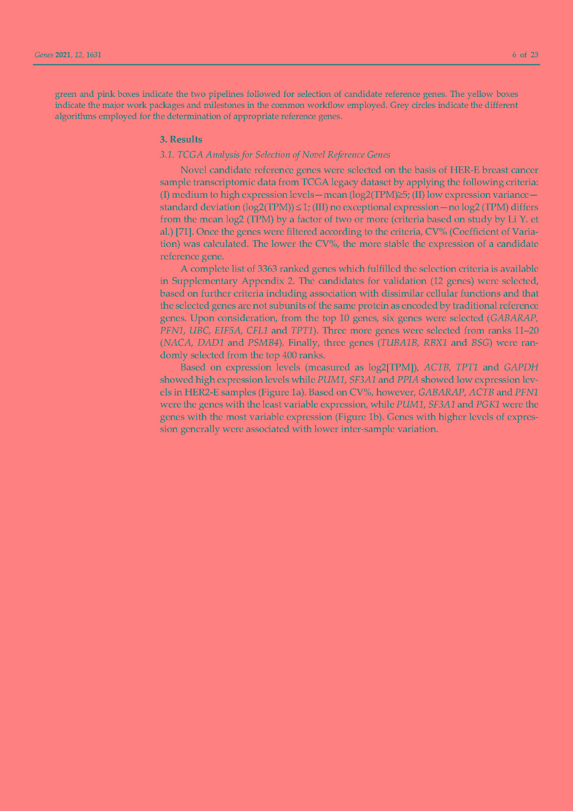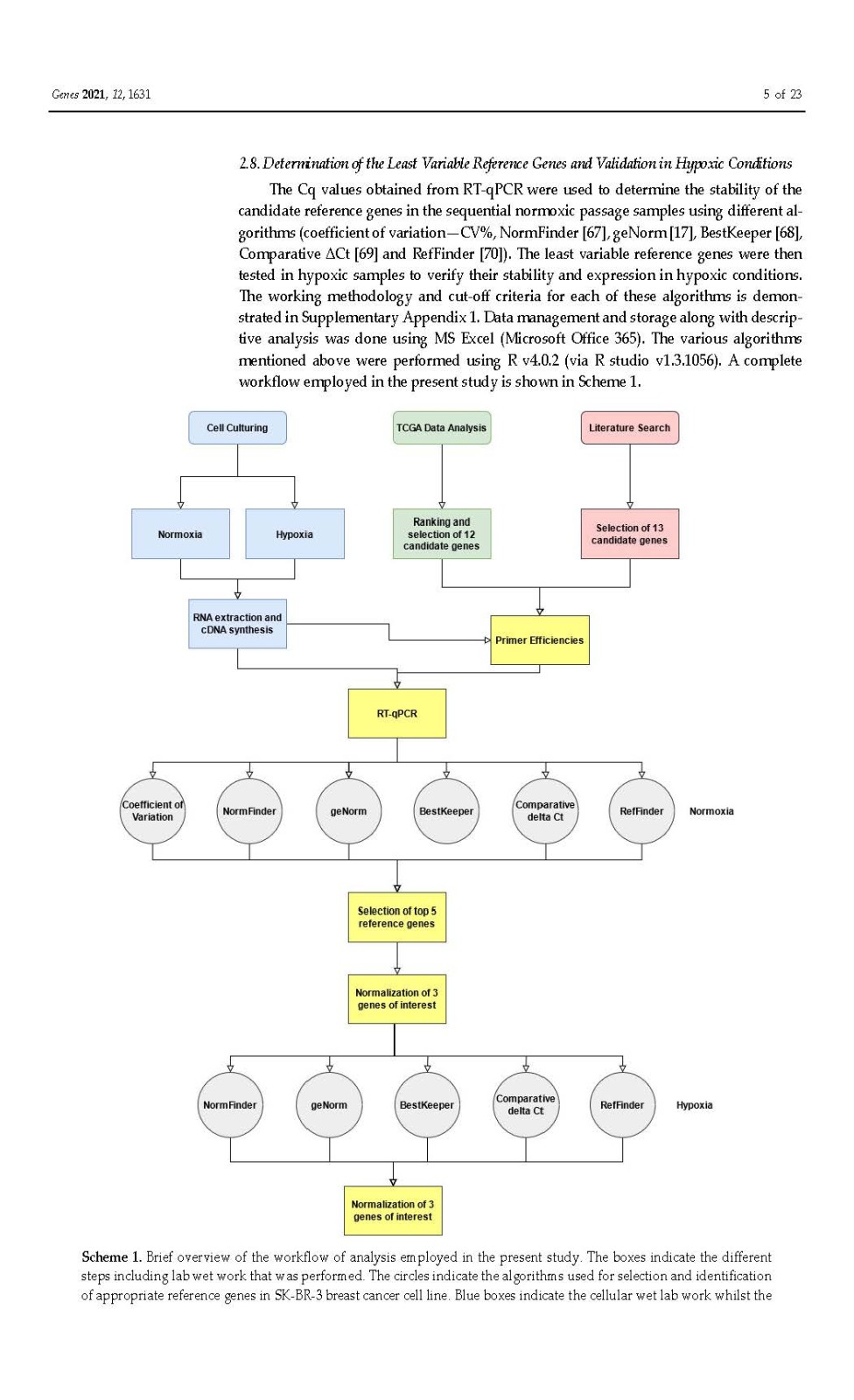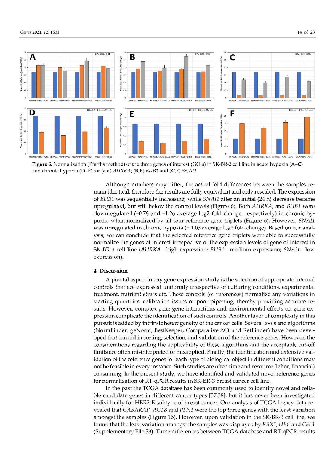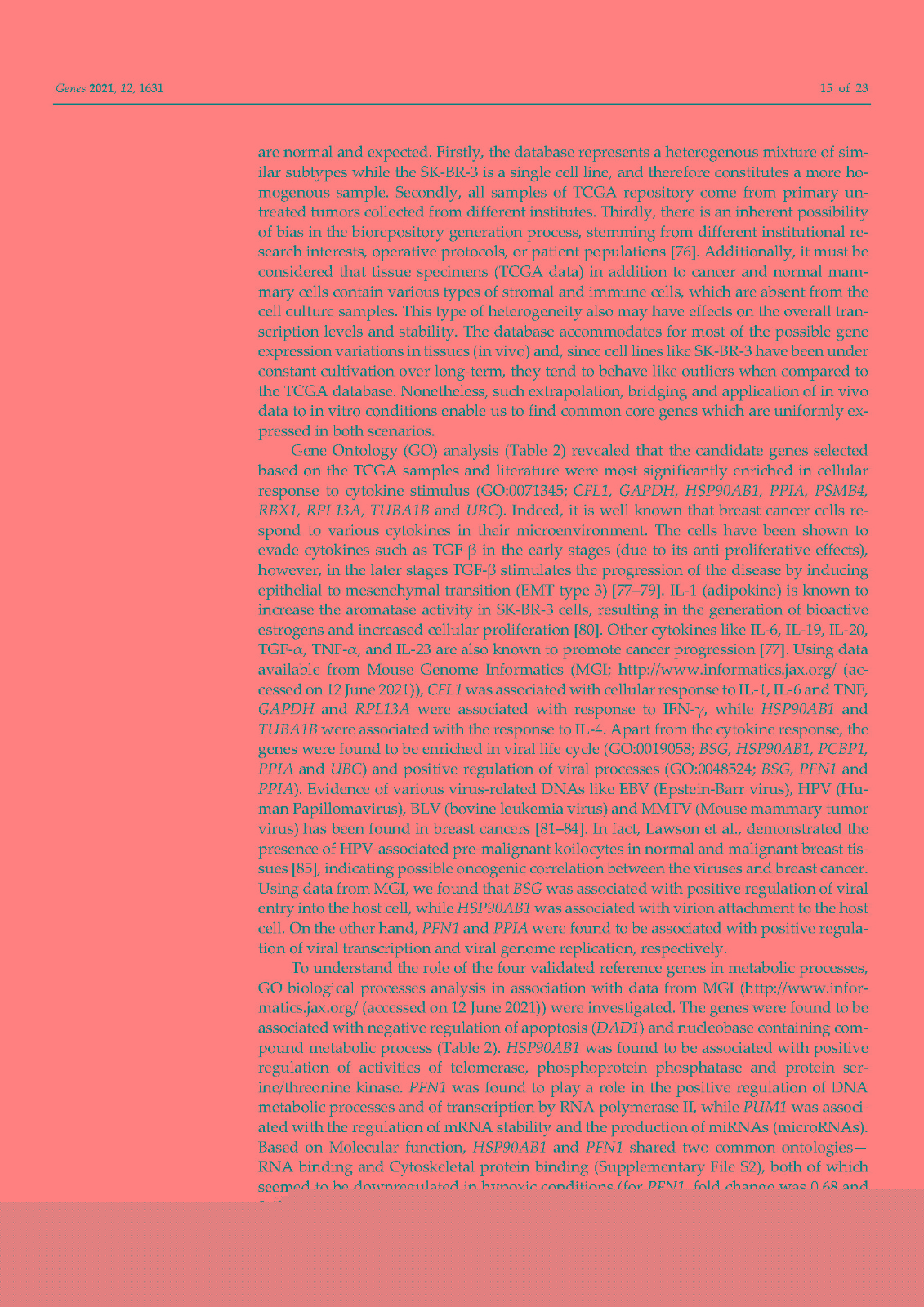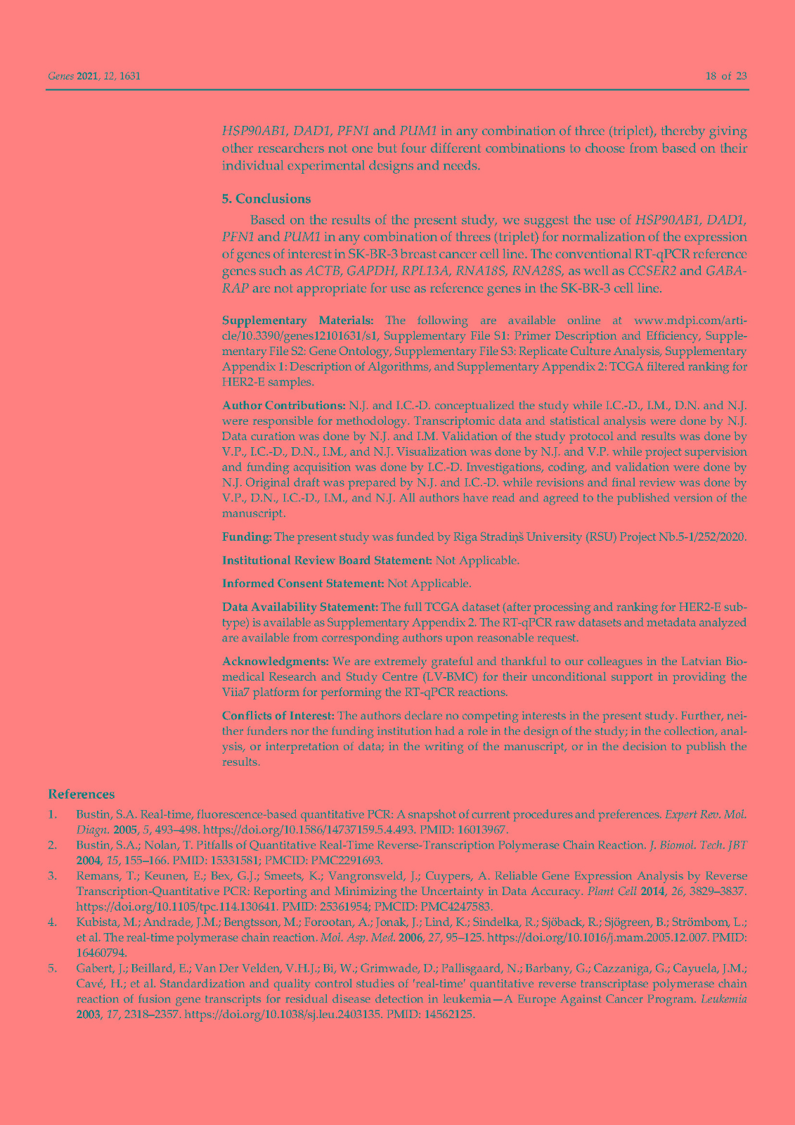 使用内部对照或参考基因 (RG) 对基因表达进行标准化已成为标准化逆转录定量聚合酶链反应 (RT-qPCR) 技术变化的首选方法。传统上,ACTB和GAPDH尽管文献中的证据不鼓励使用它们,但已被用作参考基因。因此,在本研究中,我们在富含 HER2 的乳腺癌细胞系 SK-BR-3 中鉴定并研究了新的参考基因。对来自 TCGA 数据库的 82 个 HER2-E 乳腺癌样本的转录组数据进行了分析,以确定十二个具有稳定表达的新基因。此外,还分析了文献中的 13 个 RG。在两个平行培养物 S1 和 S2 中以及在急性和慢性缺氧条件下,使用各种算法研究了候选基因的表达变化超过 5 次连续传代 (p)。最后,选择最稳定的 RGs 并验证其在常氧和缺氧条件下三个感兴趣基因 (GOI) 的表达正?;N颐堑慕峁砻?span style="font-family:Calibri;">HSP90AB1、DAD1、PFN1和PUM1可用于三个(三联体)的任意组合,以优化 SK-BR-3 细胞系中检测内和检测间的基因表达差异。此外,我们不鼓励使用传统的 RG(ACTB、GAPDH、RPL13A、RNA18S和RNA28S)作为 SK-BR-3 细胞系中 RT-qPCR 的内部对照。