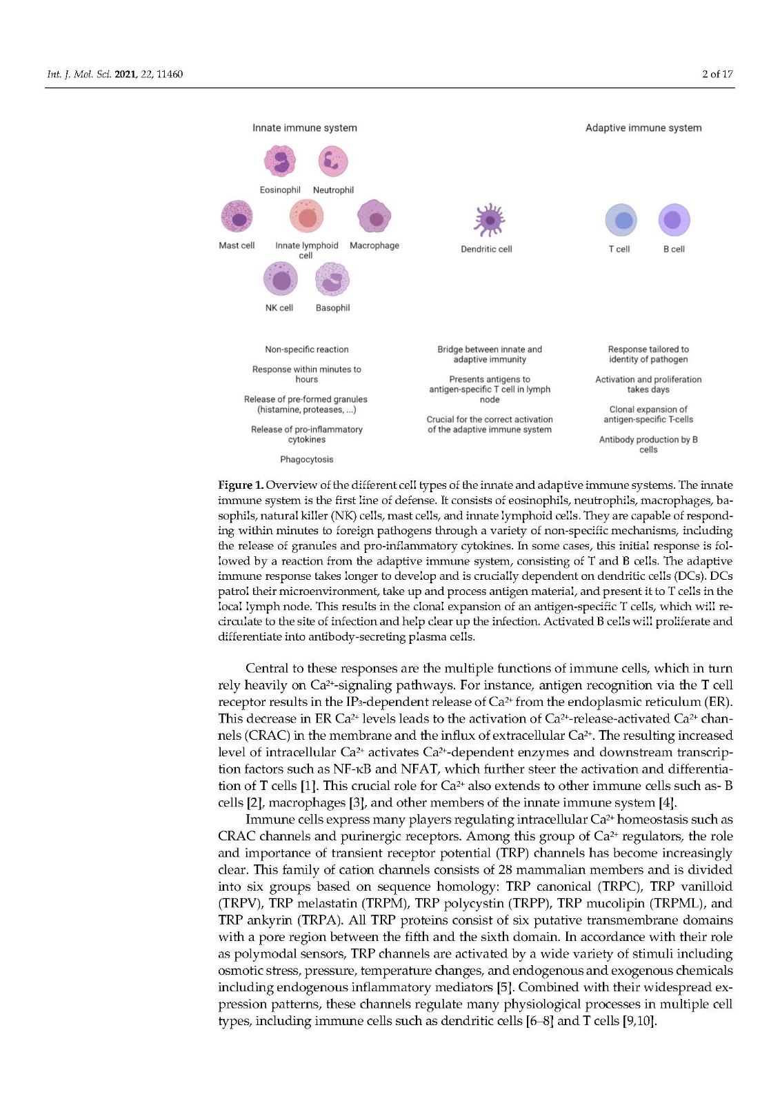 The immune system is a highly adaptable and versatile system capable of recognizing a wide range of pathogens, ranging from the smallest virus to the largest tapeworm.It consists of two interconnected branches: the innate and the adaptive immune system.The innate immune system is the first line of defense and is responsible for the fast, nonspecific, initial immune response. In addition to the defense mechanisms relying on barrier and clearance functions, which are mainly based on the activities of epithelial cells,the innate immunity is based on multiple cell types, including eosinophils, neutrophils,mast cells, innate lymphoid cells, macrophages, natural killer (NK) cells, and basophils(Figure 1). Sometimes, the innate immune system is capable of eliminating the pathogenby itself, but in other cases the adaptive immune system steps in. Dendritic cells link the two systems by detecting antigens and presenting them to T cells. The adaptive immune system, based on T and B cells, has a slower activation mechanism (5–6 days), but has a more targeted approach, tailored by the identity of the intruder. The proper activation and propagation of an immune reaction requires a balance between pro- and anti-inflam matory mediators. Disruption of this balance leads to the survival of the pathogen and/or the destruction of collateral healthy tissue.