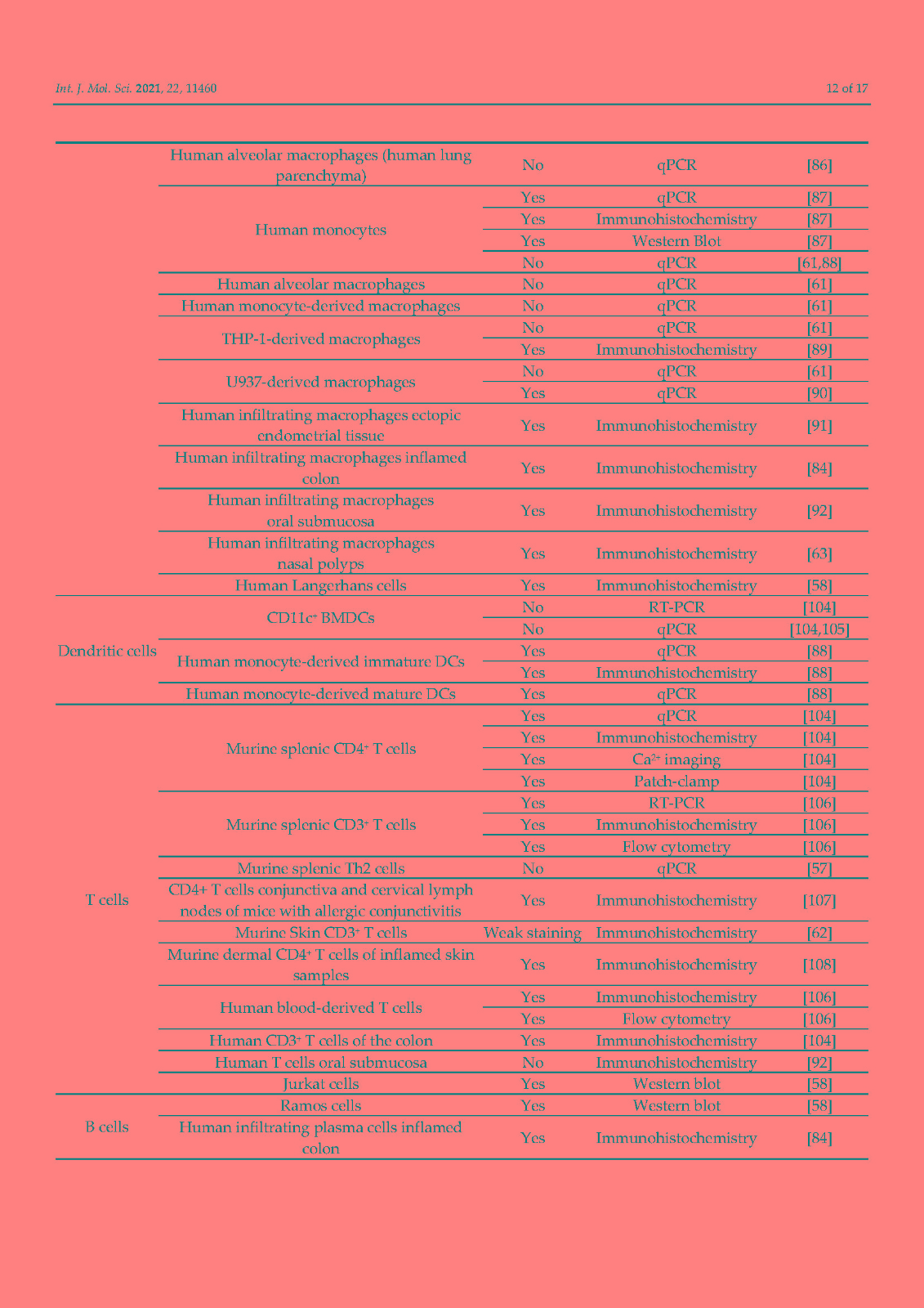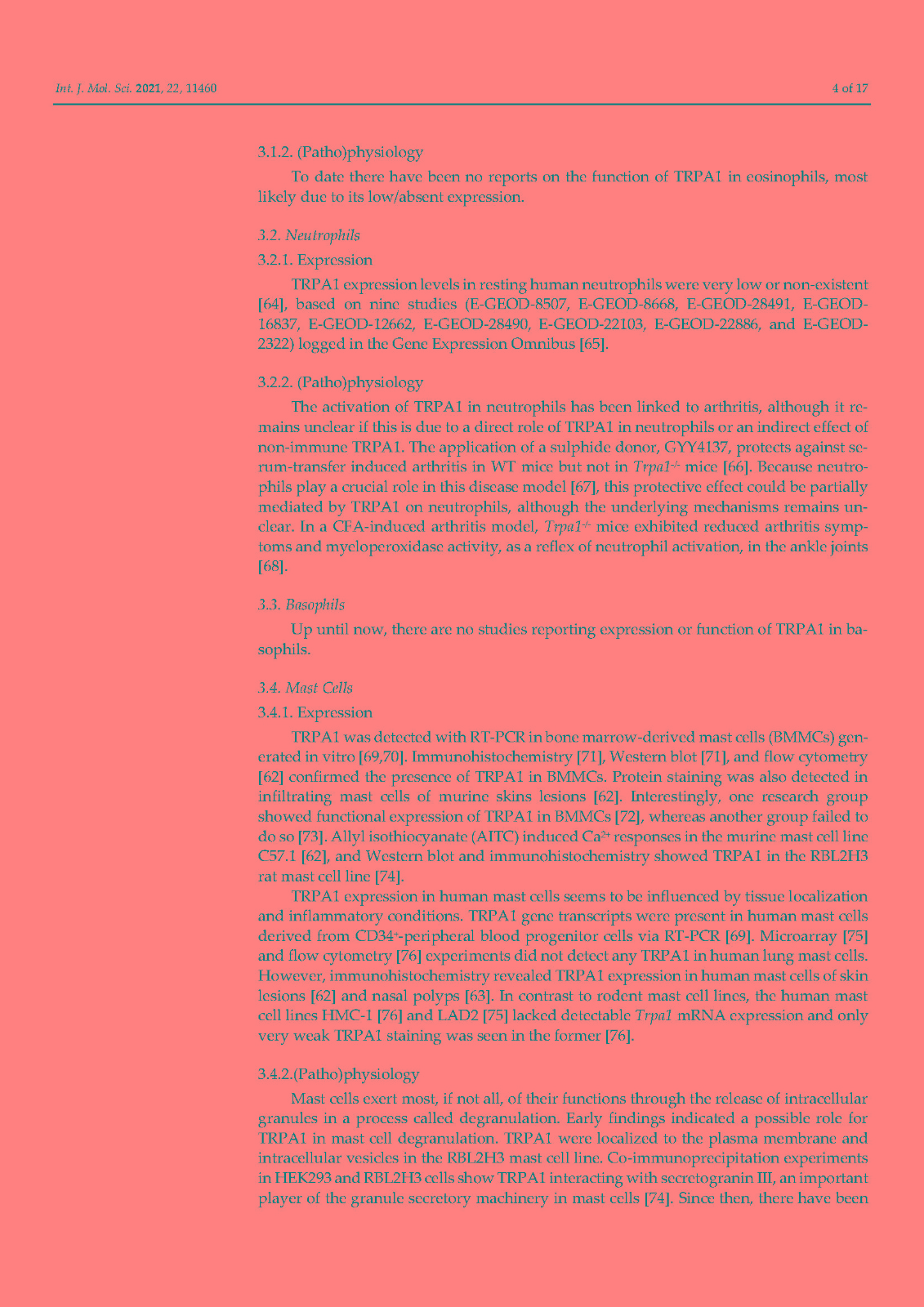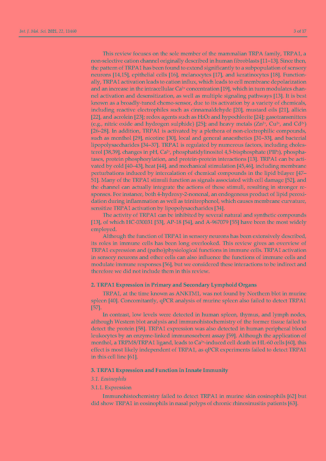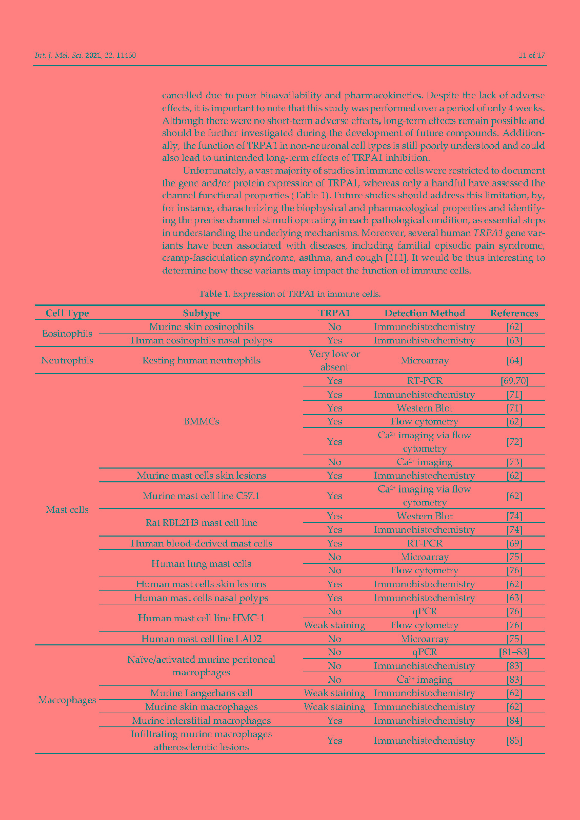 非选择性阳离子通道 TRPA1 最为人所知的是在伤害感受神经元中表达的广泛调谐的传感器,它在化学、热和机械传感中发挥关键作用。然而,在这篇综述中,我们说明了这个通道是如何在免疫系统细胞中表达的。已在嗜酸性粒细胞、肥大细胞、巨噬细胞、树突细胞、T 细胞和 B 细胞中检测到 TRPA1,主要是通过生化技术,但未在中性粒细胞中检测到。相比之下,功能测量仍然非常稀缺。没有关于嗜碱性粒细胞和 NK 细胞的研究报告。免疫细胞中的 TRPA1 与关节炎(中性粒细胞)、过敏反应和特应性皮炎(肥大细胞)、动脉粥样硬化、肾损伤、心脏肥大和炎症性肠病(巨噬细胞)以及结肠炎(T 细胞)有关。TRPA1 对免疫的贡献是双重的:作为细胞应激、组织损伤和外源性有害刺激的检测器,它会导致防御反应,但在异常调节的情况下,它会导致炎症恶化。未来的研究应旨在表征免疫细胞中 TRPA1 的功能特性,这是了解其在炎症中的作用及其作为治疗靶点的潜力的重要一步。