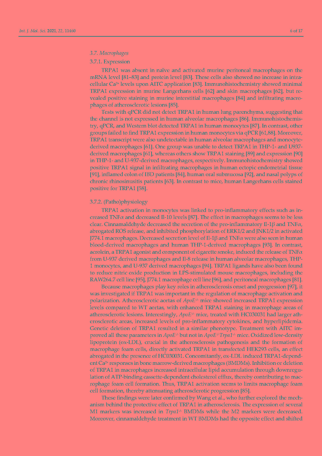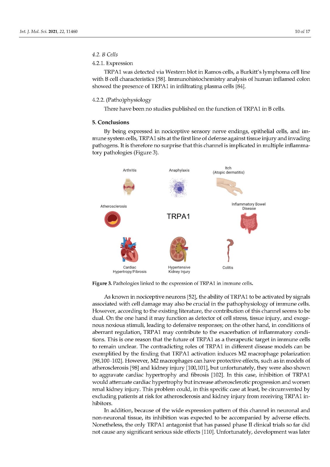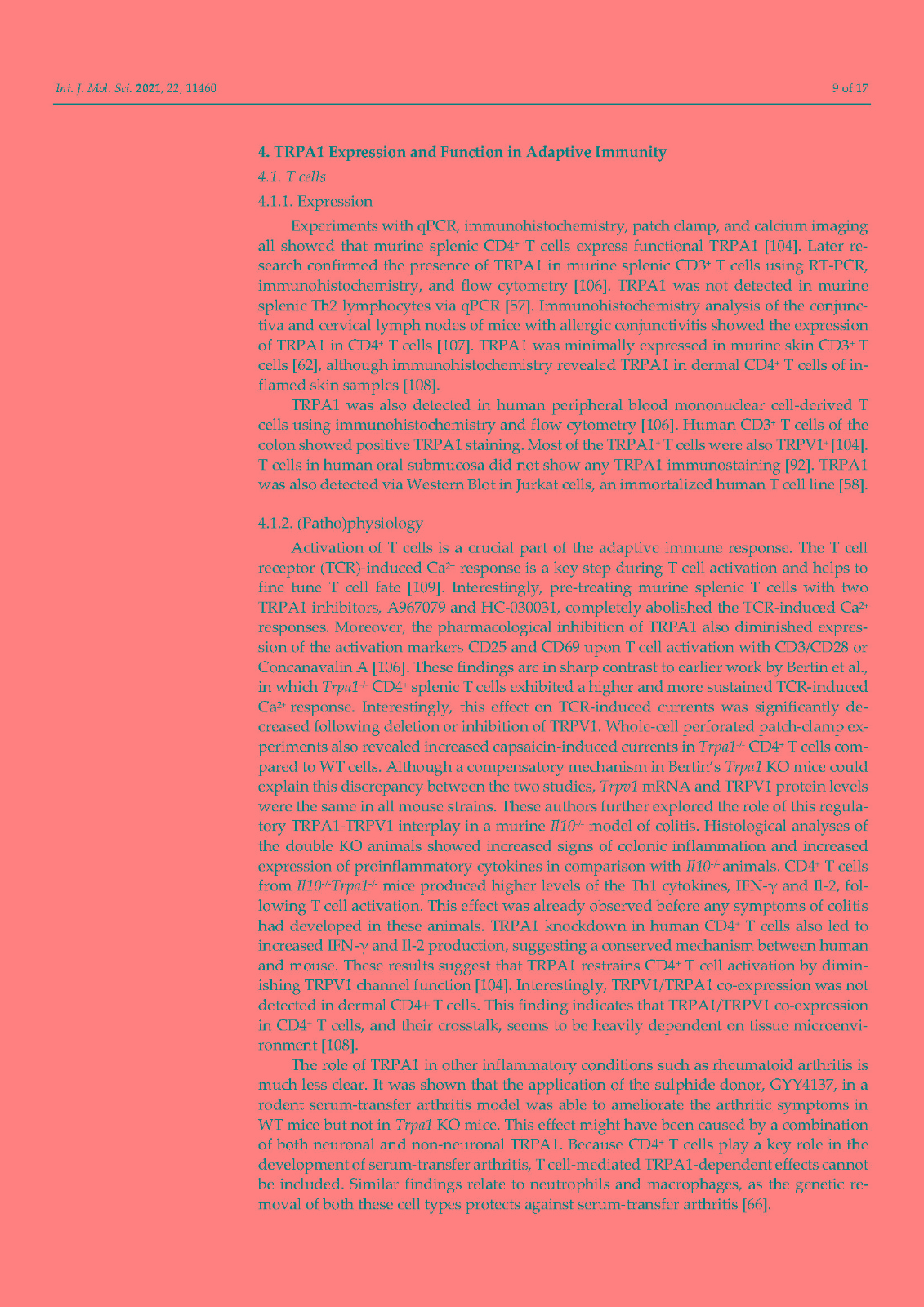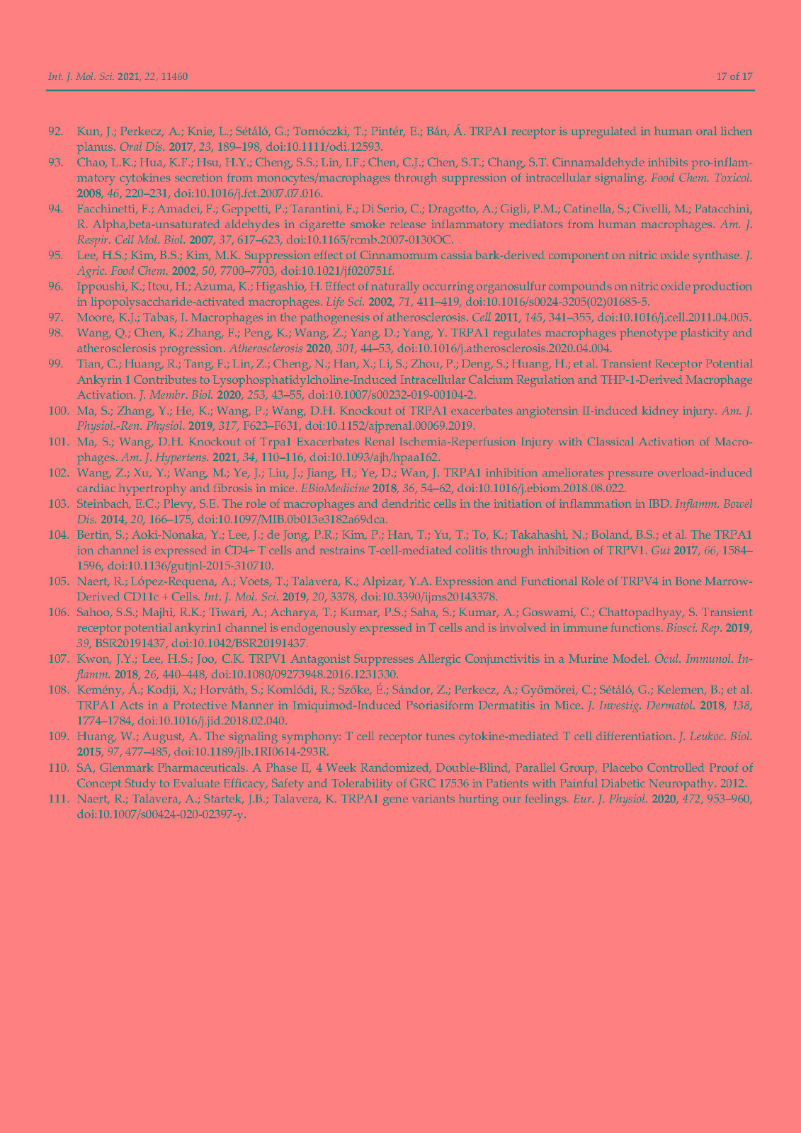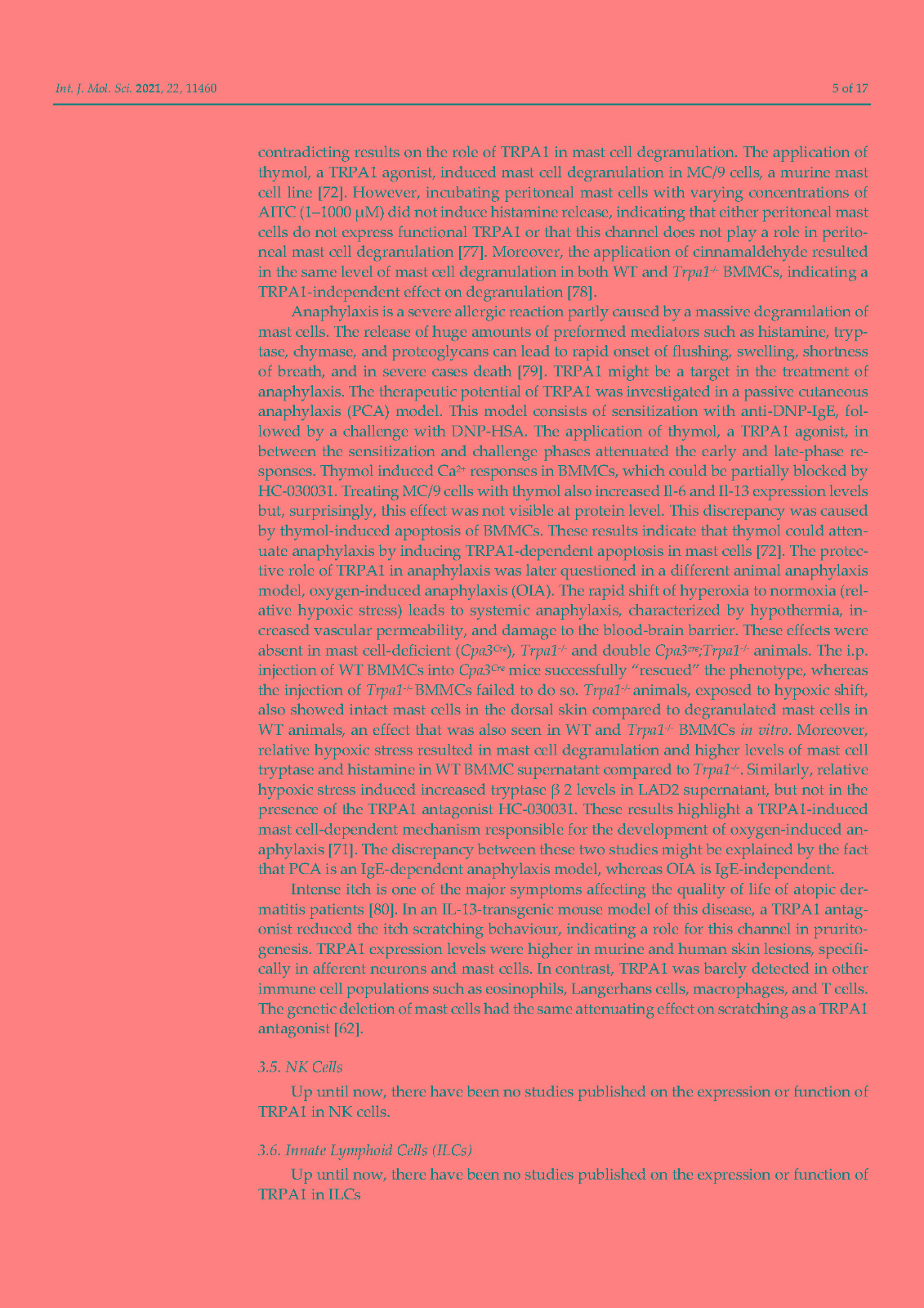 非选择性阳离子通道 TRPA1 最为人所知的是在伤害感受神经元中表达的广泛调谐的传感器,它在化学、热和机械传感中发挥关键作用。然而,在这篇综述中,我们说明了这个通道是如何在免疫系统细胞中表达的。已在嗜酸性粒细胞、肥大细胞、巨噬细胞、树突细胞、T 细胞和 B 细胞中检测到 TRPA1,主要是通过生化技术,但未在中性粒细胞中检测到。相比之下,功能测量仍然非常稀缺。没有关于嗜碱性粒细胞和 NK 细胞的研究报告。免疫细胞中的 TRPA1 与关节炎(中性粒细胞)、过敏反应和特应性皮炎(肥大细胞)、动脉粥样硬化、肾损伤、心脏肥大和炎症性肠病(巨噬细胞)以及结肠炎(T 细胞)有关。TRPA1 对免疫的贡献是双重的:作为细胞应激、组织损伤和外源性有害刺激的检测器,它会导致防御反应,但在异常调节的情况下,它会导致炎症恶化。未来的研究应旨在表征免疫细胞中 TRPA1 的功能特性,这是了解其在炎症中的作用及其作为治疗靶点的潜力的重要一步。