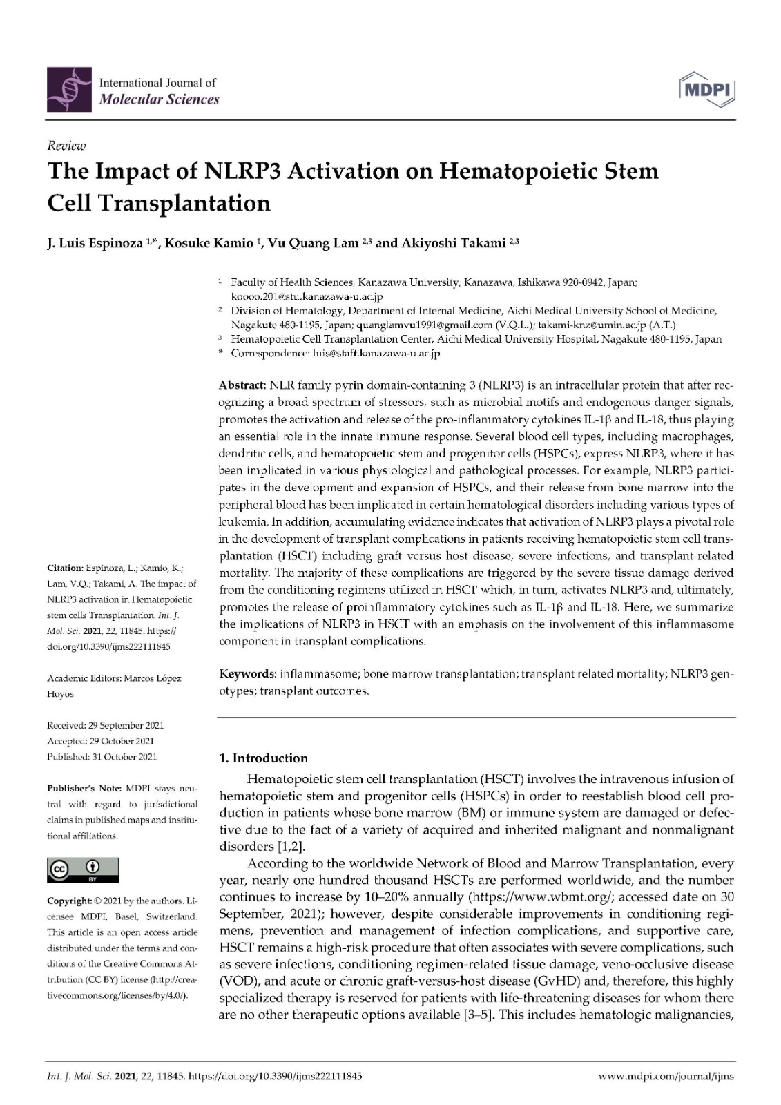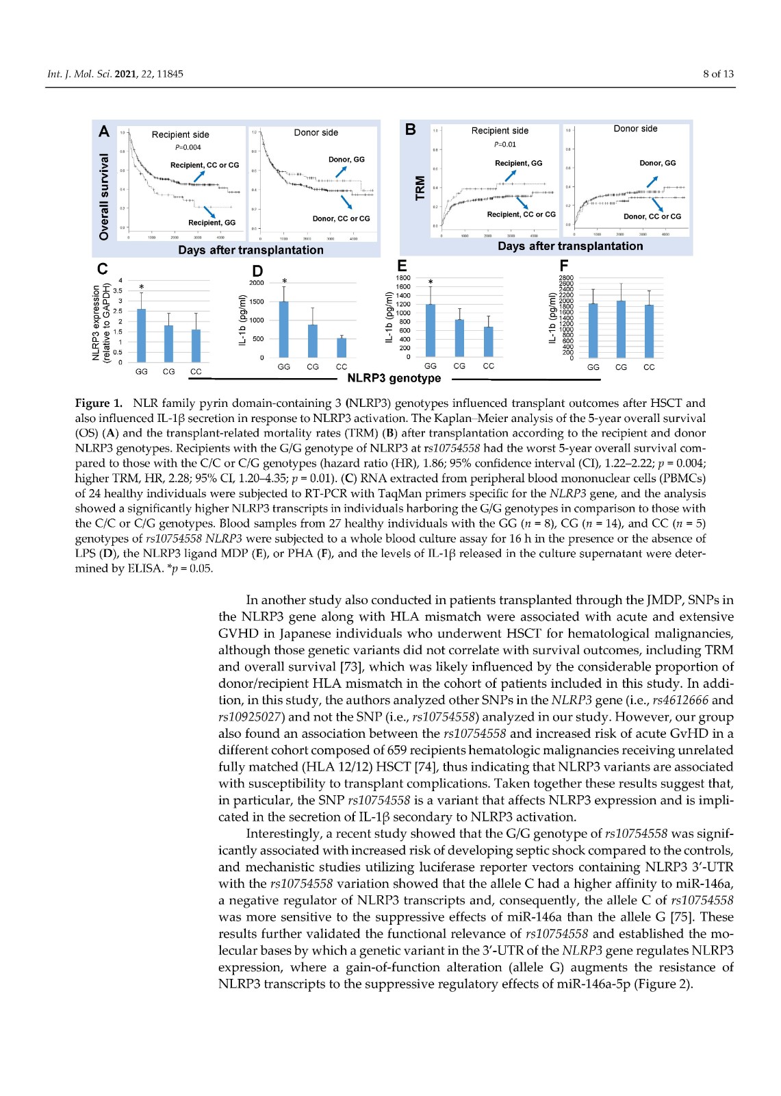 In addition, accumulating evidence indicates that activation of NLRP3 plays a pivotal role in the development of transplant complications in patients receiving hematopoietic stem cell transplantation (HSCT) including graft versus host disease, severe infections, and transplant-related mortality. The majority of these complications are triggered by the severe tissue damage derived from the conditioning regimens utilized in HSCT which, in turn, activates NLRP3 and, ultimately, promotes the release of proinflammatory cytokines such as IL-1β and IL-18. Here, we summarize the implications of NLRP3 in HSCT with an emphasis on the involvement of this inflammasome component in transplant complications.