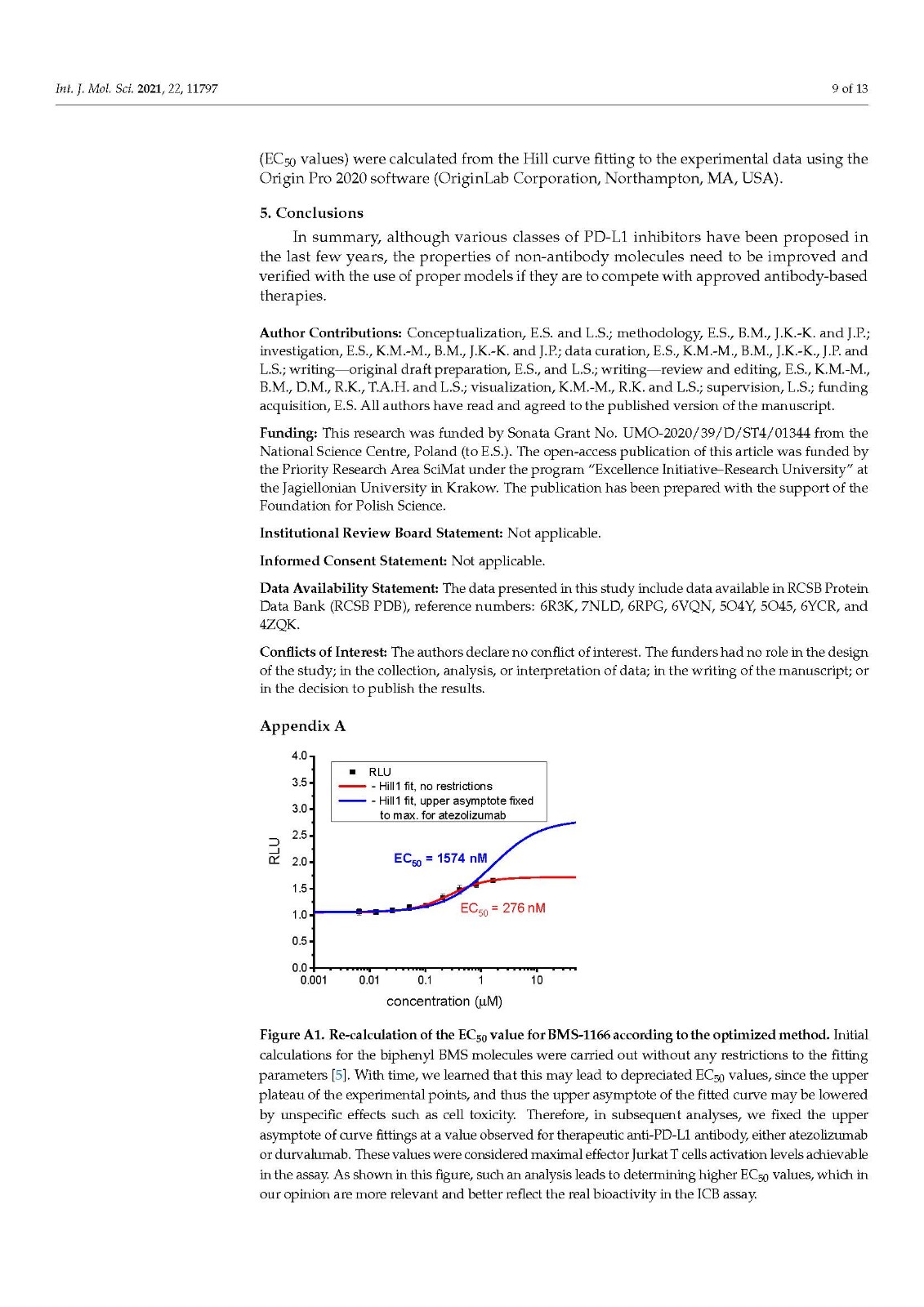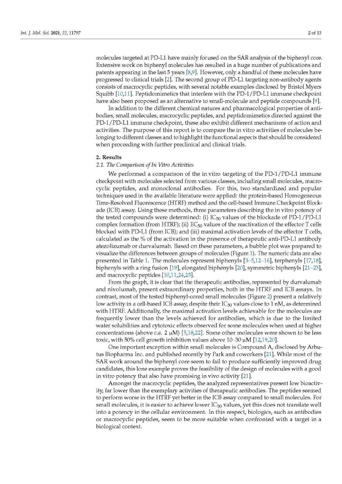 We performed a comparison of the in vitro targeting of the PD-1/PD-L1 immune checkpoint with molecules selected from various classes, including small molecules, macrocyclic peptides, and monoclonal antibodies. For this, two standardized and popular techniques used in the available literature were applied: the protein-based Homogeneous Time-Resolved Fluorescence (HTRF) method and the cell-based Immune Checkpoint Blockade (ICB) assay. Using these methods, three parameters describing the in vitro potency of the tested compounds were determined: (i) IC50 values of the blockade of PD-1/PD-L1 complex formation (from HTRF); (ii) EC50 values of the reactivation of the effector T cells blocked with PD-L1 (from ICB); and (iii) maximal activation levels of the effector T cells, calculated as the % of the activation in the presence of therapeutic anti-PD-L1 antibody atezolizumab or durvalumab. Based on these parameters, a bubble plot was prepared to visualize the differences between groups of molecules (Figure 1). The numeric data are also presented in Table 1.