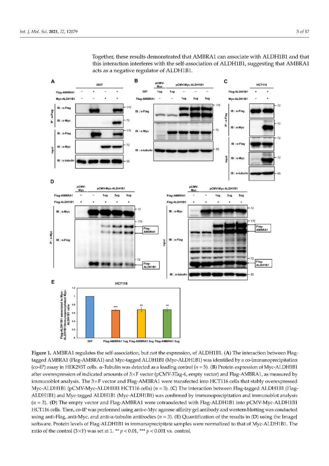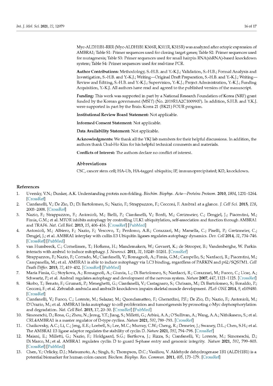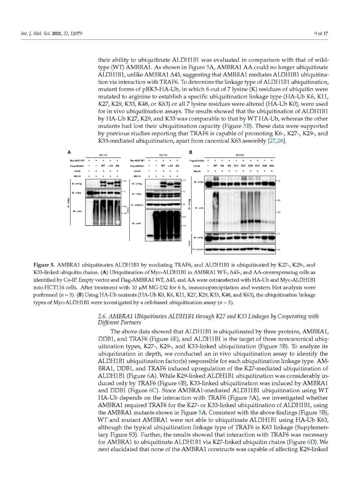 According to the Biological General Repository for Interaction Datasets (thebiogrid.org, Accessed 15 December 2020), ALDH1B1 has been identified as one of the AMBRA1-interacting proteins via affinity purification-mass spectrometry analysis of Flag-AMBRA1-transfected HEK293T human embryonic kidney cells [18]. However, the biological significance of the interaction between AMBRA1 and ALDH1B1 is not yet understood. Here, for the first time, we show that AMBRA1 downregulates the self-association and enzyme activity of ALDH1B1, and subsequently regulates CSC-associated Wnt/β-catenin signaling in an ALDH1B1-dependent manner. Mechanistically, AMBRA1 controls ALDH1B1 function via the ubiquitination of ALDH1B1 with K27- and K33-linked ubiquitin chains. Further, we found that TRAF6 and DDB1, an adaptor protein of the CRL4 complex, are able to ubiquitinate ALDH1B1 in an AMBRA1-independent fashion.