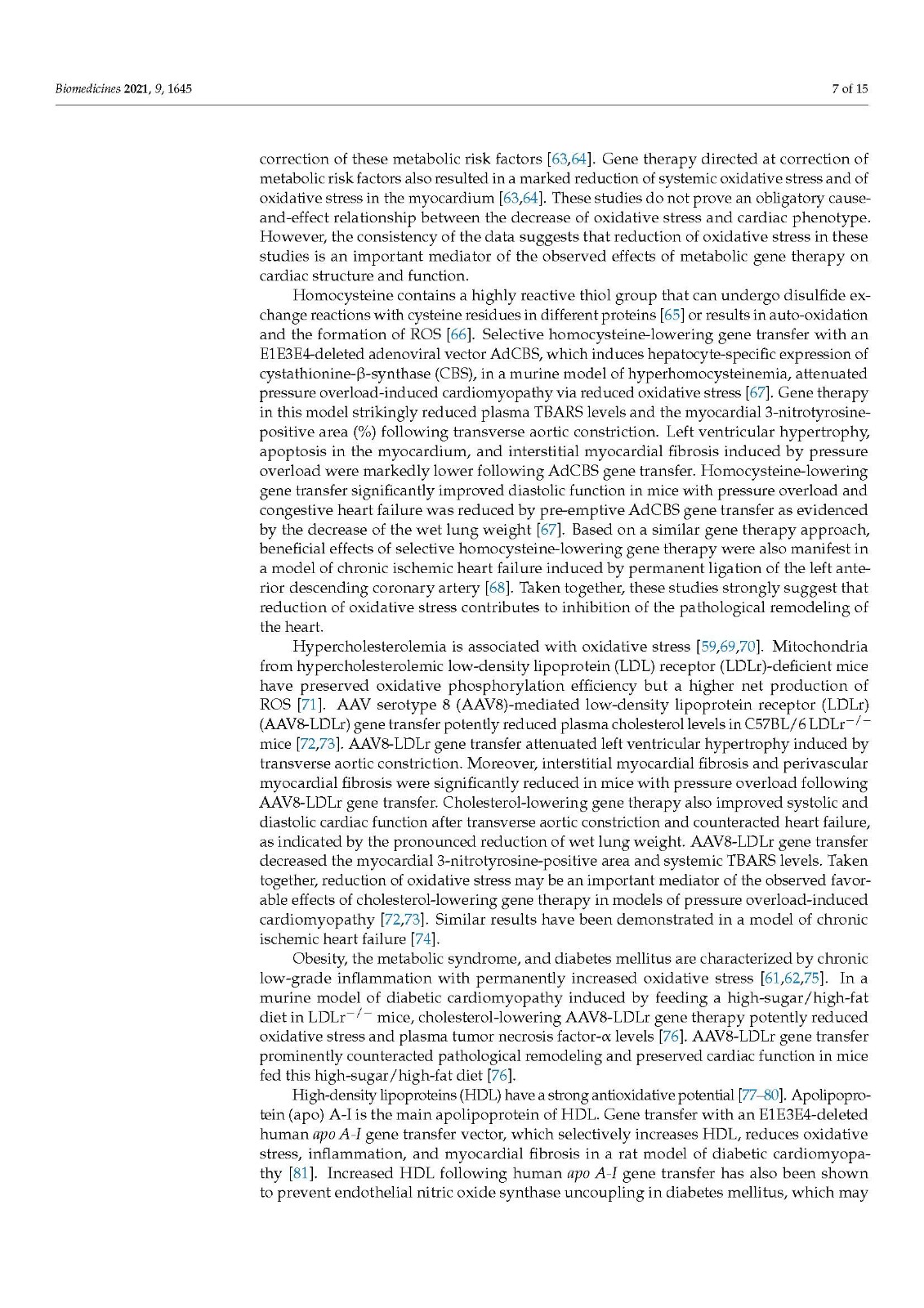 Furthermore, the cellular levels of redox-sensitive microRNAs are altered in response to oxidative stress, and increasing evidence indicates that these redox-sensitive microRNAs constitute potential therapeutic targets for the treatment of heart failure [105,121,122,123]. The causal role of oxidative stress in heart failure is also supported by gene transfer studies of the three primary antioxidant enzymes (SODs, catalase, and glutathione peroxidase), of thioredoxin, and of heme oxygenase-1. Finally, multiple gene transfer prevention and intervention studies have demonstrated that gene therapy directed at the correction of metabolic risk factors resulted in a marked reduction of systemic oxidative stress and oxidative stress in the myocardium [63,64]. This correction of metabolic risk factors also resulted in improved cardiac function and prevention or reversal of pathological remodeling and heart failure [63,64]. The broad robustness of the strong link between reduction of oxidative stress and prevention and treatment of heart failure suggests that reduction of oxidative stress is an important mediator of the observed effects of metabolic gene therapy on cardiac structure and function.