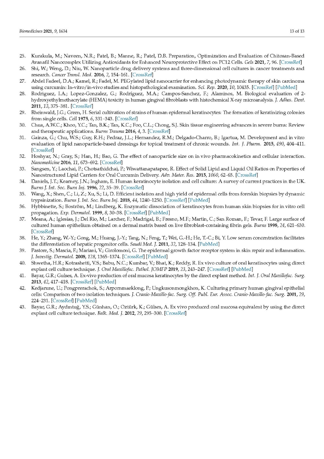 人类皮肤角质形成细胞原代培养物可以从皮肤活检标本中建立,培养基中含有上皮生长因子 (EGF)。虽然目前的方法是有效的,但需要优化以加快程序并在更短的时间内获得这些文化。在本研究中,我们评估了基于装载 EGF 的纳米结构脂质载体 (NLC) 的新型制剂的效果。首先,通过量化释放到培养基中的游离 DNA,在永生化皮肤角质形成细胞和角膜上皮细胞以及两种上皮癌细胞系中验证了含有重组人 EGF (NLC-rhEGF) 的 NLC 的生物安全性。然后我们用基础培养基 (BM) 和 BM 建立了人类皮肤角质形成细胞的原代细胞培养物,其中补充了 NLC-rhEGF、液体 EGF (L-rhEGF) 或单独的 NLC (NLC-空白)。结果表明,无论使用何种培养基,通过酶消化分离并在有或没有饲养层的情况下培养的细胞都具有相似的生长速率。然而,与 BM、L-rhEGF 或 NLC 空白相比,当使用 NLC-rhEGF 培养基时,外植体技术显示出更高的效率?;虮泶锓治霰砻?/span>NLC-rhEGF能够增加EGFR基因表达,以及与细胞角蛋白、细胞-细胞连接和角质细胞成熟和分化相关的其他基因的表达。总之,这些结果支持使用 NLC-rhEGF 来提高基于外植体的方法在有效生成用于组织工程的人角质形成细胞原代细胞培养物的效率。
