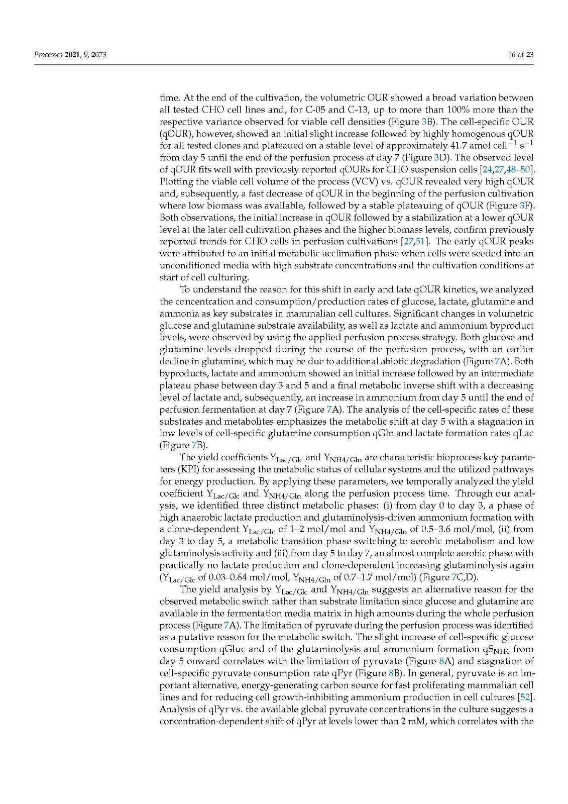 在哺乳动物细胞培养中,尤其是在药物制造和研究中,生物量和代谢监测对于开发和最终控制生物过程的各种细胞培养过程步骤是必不可少的。作为生物量的常用度量,活细胞密度 (VCD) 或活细胞体积 (VCV) 被广泛使用。本研究首次强调了使用 VCV 代替 VCD 作为生物量描述的优势,结合基于吸氧率 (OUR) 的软传感器,用于实时生物量估算和一次性过程控制中国仓鼠卵巢 (CHO) 细胞系的生物反应器 (SUB) 连续过程。我们研究了一系列 14 个技术上相似的连续 SUB 工艺,其中使用了相同的工艺条件但使用了不同的表达 CHO 细胞系,关于生物量增长和需氧量来校准我们的模型。此外,我们通过外代谢组学方法分析了 SUB 灌注过程中 CHO 细胞的关键代谢,强调了细胞特异性底物和代谢物消耗以及生产率 qS 分析对识别不同代谢阶段的重要性。CHO 灌注过程中经典哺乳动物细胞培养关键底物和代谢物的细胞特异性速率显示出与 qOUR 的良好相关性,但出人意料的是,与 qGluc 无关。在这里,我们介绍了我们为 qPyr 开发的软传感方法,以允许实时近似细胞代谢和使用情况,以便进行后续深入的过程监测、表征和优化。我们通过外代谢组学方法分析了 SUB 灌注过程中 CHO 细胞的关键代谢,强调了细胞特异性底物和代谢物消耗以及生产率 qS 分析对识别不同代谢阶段的重要性。CHO 灌注过程中经典哺乳动物细胞培养关键底物和代谢物的细胞特异性速率显示出与 qOUR 的良好相关性,但出人意料的是,与 qGluc 无关。在这里,我们介绍了我们为 qPyr 开发的软传感方法,以允许实时近似细胞代谢和使用情况,以便进行后续深入的过程监测、表征和优化。我们通过外代谢组学方法分析了 SUB 灌注过程中 CHO 细胞的关键代谢,强调了细胞特异性底物和代谢物消耗以及生产率 qS 分析对识别不同代谢阶段的重要性。CHO 灌注过程中经典哺乳动物细胞培养关键底物和代谢物的细胞特异性速率显示出与 qOUR 的良好相关性,但出人意料的是,与 qGluc 无关。在这里,我们介绍了我们为 qPyr 开发的软传感方法,以允许实时近似细胞代谢和使用情况,以便进行后续深入的过程监测、表征和优化。强调细胞特异性底物和代谢物消耗和生产率 qS 分析的重要性,以确定不同的代谢阶段。CHO 灌注过程中经典哺乳动物细胞培养关键底物和代谢物的细胞特异性速率显示出与 qOUR 的良好相关性,但出人意料的是,与 qGluc 无关。在这里,我们介绍了我们为 qPyr 开发的软传感方法,以允许实时近似细胞代谢和使用情况,以便进行后续深入的过程监测、表征和优化。强调细胞特异性底物和代谢物消耗和生产率 qS 分析的重要性,以确定不同的代谢阶段。CHO 灌注过程中经典哺乳动物细胞培养关键底物和代谢物的细胞特异性速率显示出与 qOUR 的良好相关性,但出人意料的是,与 qGluc 无关。在这里,我们介绍了我们为 qPyr 开发的软传感方法,以允许实时近似细胞代谢和使用情况,以便进行后续深入的过程监测、表征和优化。