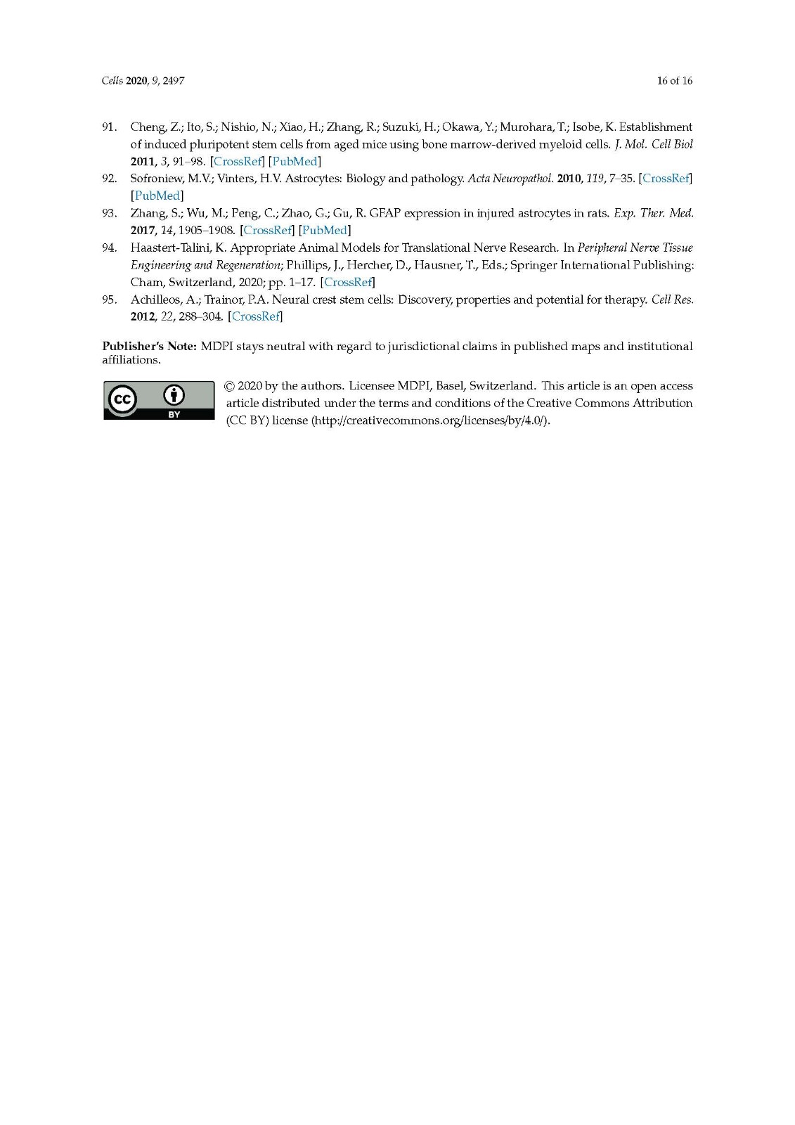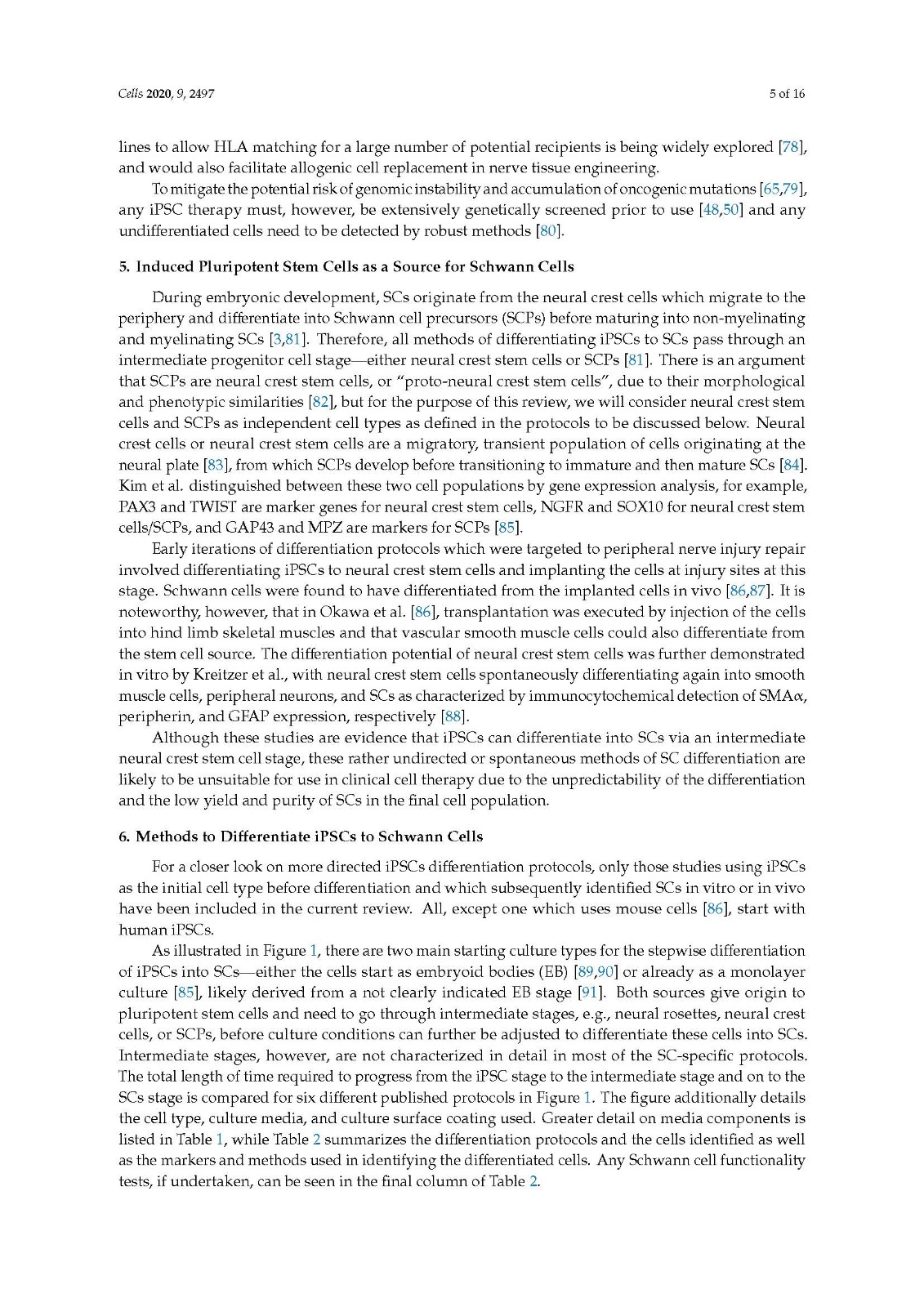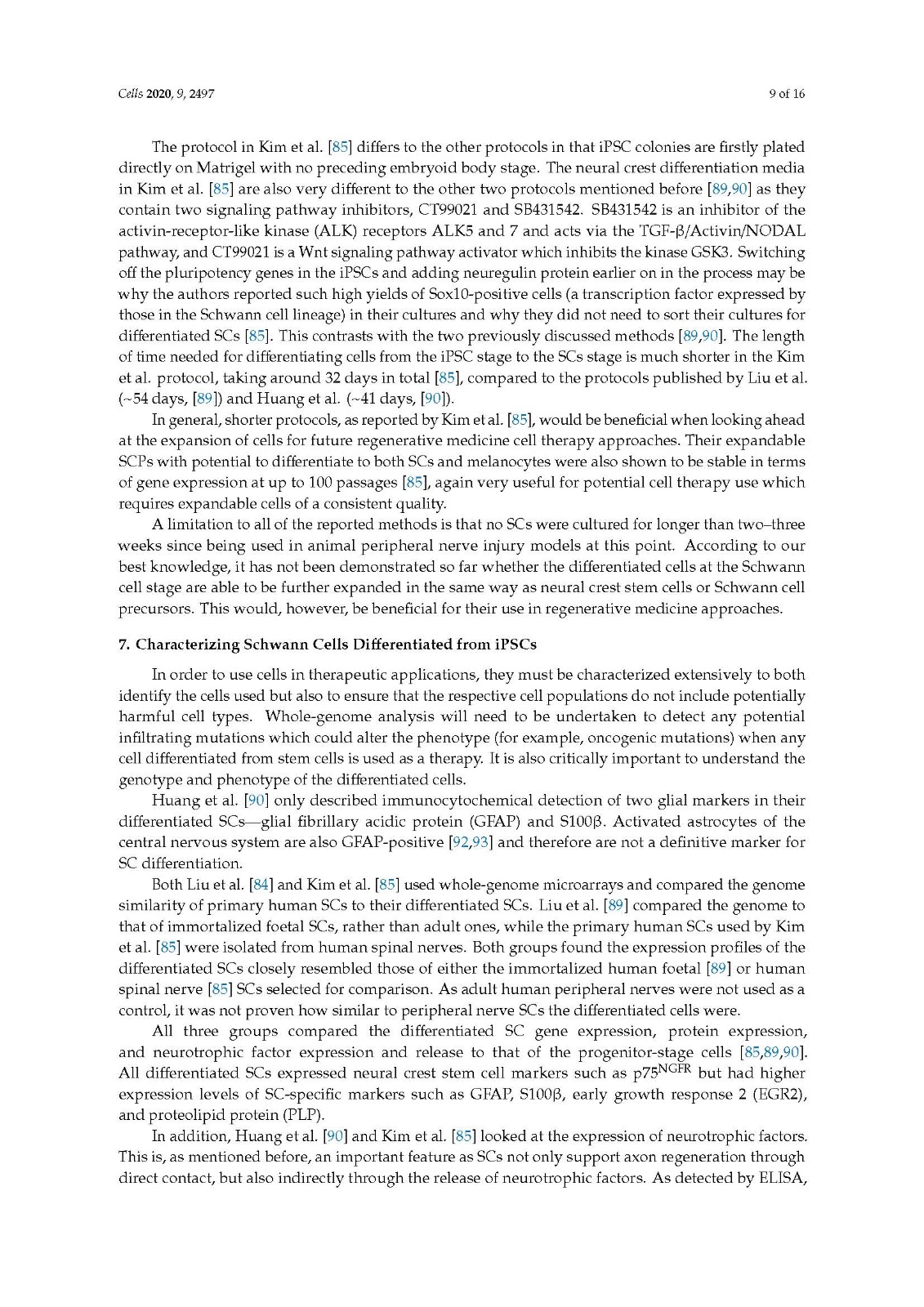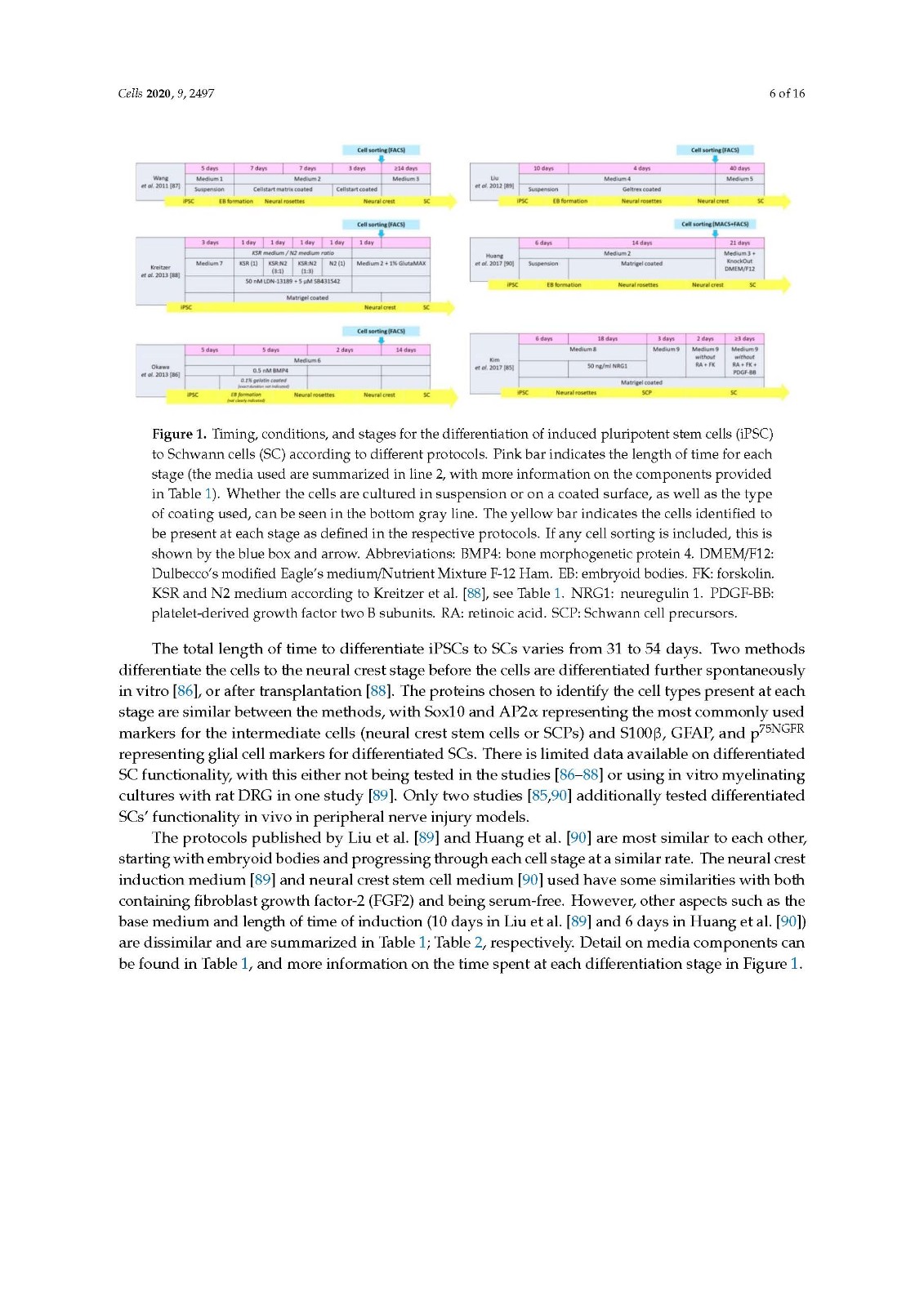 There are several protocols differentiating iPSCs to neural crest stem cells, with the three studies looked at in the current review [85,89,90] including a step to differentiate progenitor cells to SCs, showing promising outcomes both in vitro and in vivo. All three methods generate differentiated cells that express SC markers and release neurotrophic factors. A clear comparison of in vivo outcomes on peripheral nerve repair cannot be made due to the varied choice of animal models used.