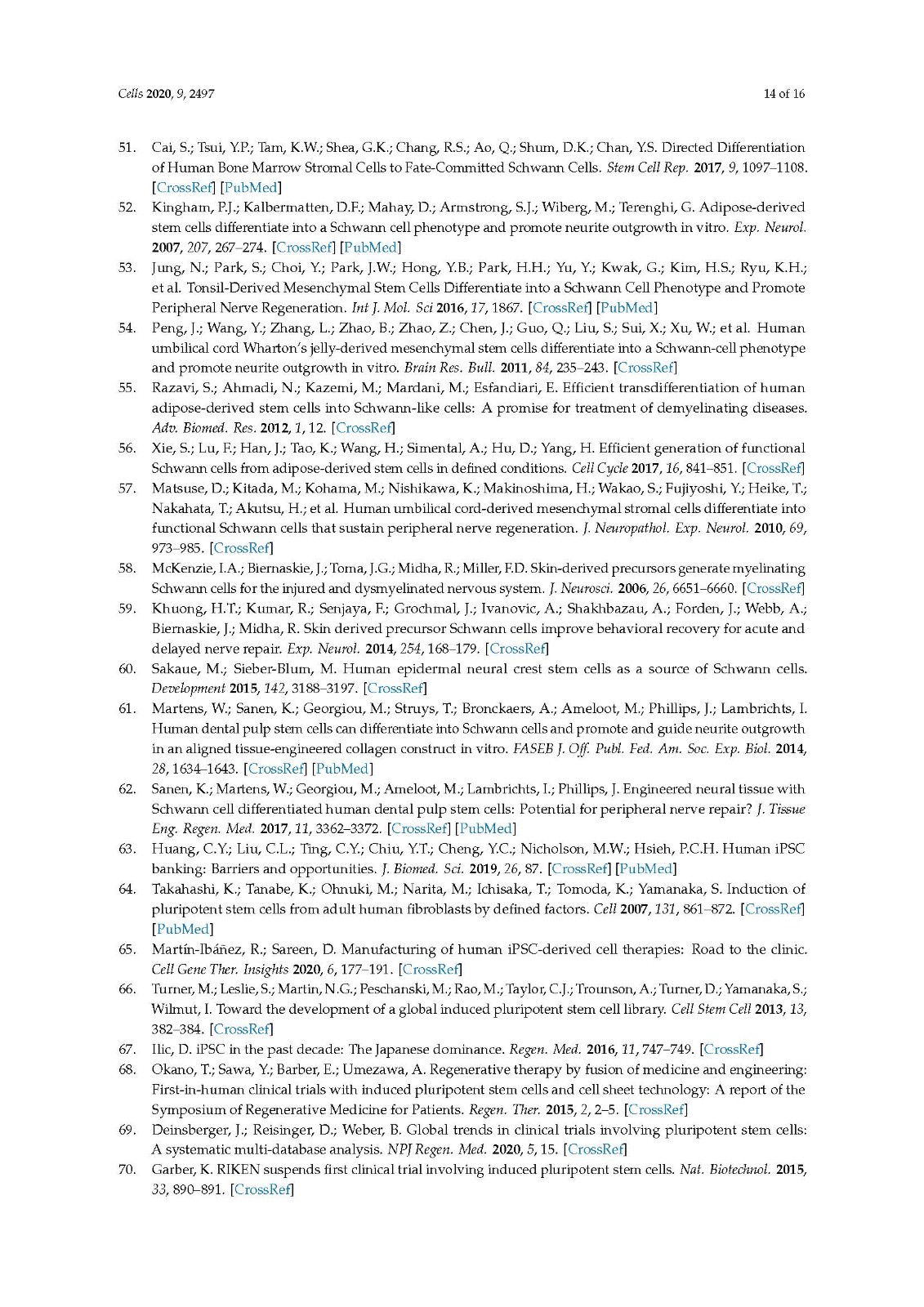Schwann cells play a critical role in peripheral nerve repair through axon guidance and promoting the establishment of a pro-regenerative environment in the nerve bridge. However, primary SCs may not be ideal for efficient use in cell therapies, due mainly to difficulties in purifying and a long expansion process. Despite extensive efforts to develop reliable methods to differentiate stem cells to SCs as an alternative source, both adult stem cells and ESCs have drawbacks—from low purity and yield, non-neuronal differentiation potential, and accessibility of cells, to ethical considerations. Although therapies using differentiated cells sourced from iPSCs will require extensive screening prior to use, iPSCs have the benefits of ESCs without the drawback of ethical concerns which have been cited as a potential barrier to the application of ESC therapies worldwide.