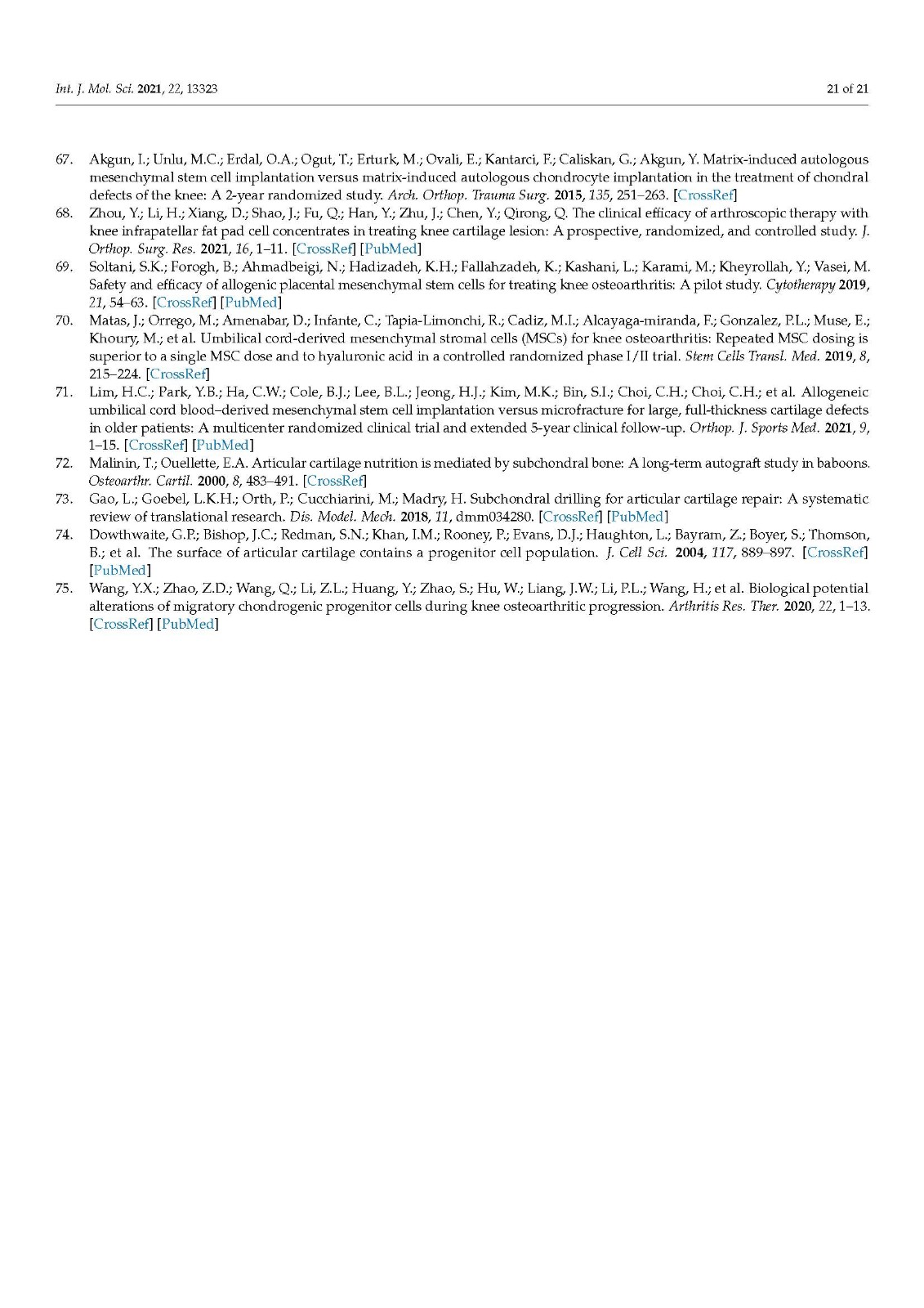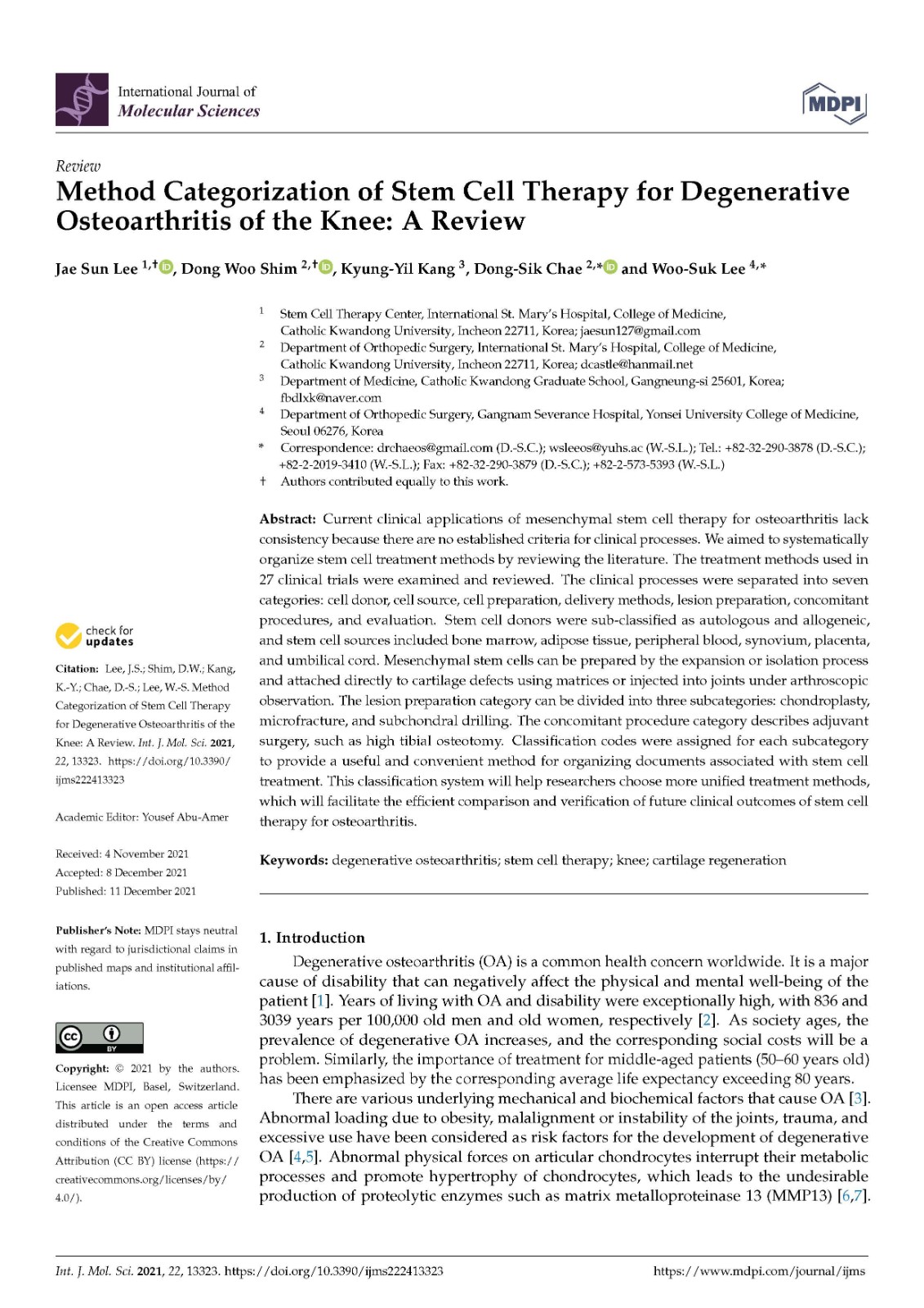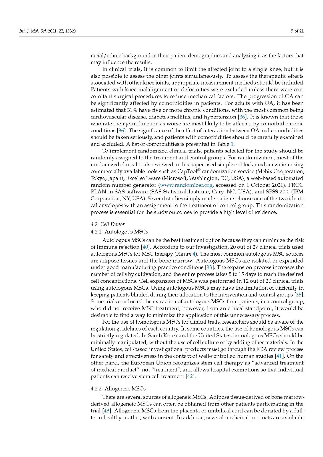 Additional parameters can be added in future clinical studies. Cell sources can include MSCs from molar cells, amniotic fluid, and induced pluripotent stem cells. Some alternative cell sources, such articular cartilage progenitors and chondrogenic progenitor cells that have the potential to treat OA can also be considered as new parameters [74,75]. The addition of various treatment factors, such as PRP, hyaluronic acid, and some growth factors, can be considered as a new category. Low-intensity pulsed ultrasound (LIPUS), meniscectomy, and anterior cruciate ligament (ACL) reconstruction can be attempted as additional concomitant procedures. Since current MSC therapies are inconsistent and lack homogeneity, the classification system proposed in this study is expected to facilitate the efficient comparison and verification of clinical outcomes from MSC therapy for degenerative OA. Furthermore, if the analysis of the clinical results for each category is accumulated, the optimal combinations of efficient stem cell treatment methods can be found.