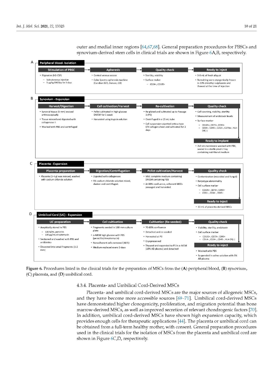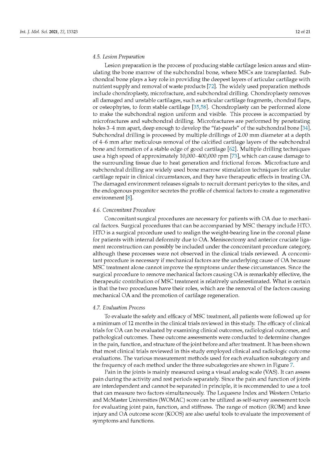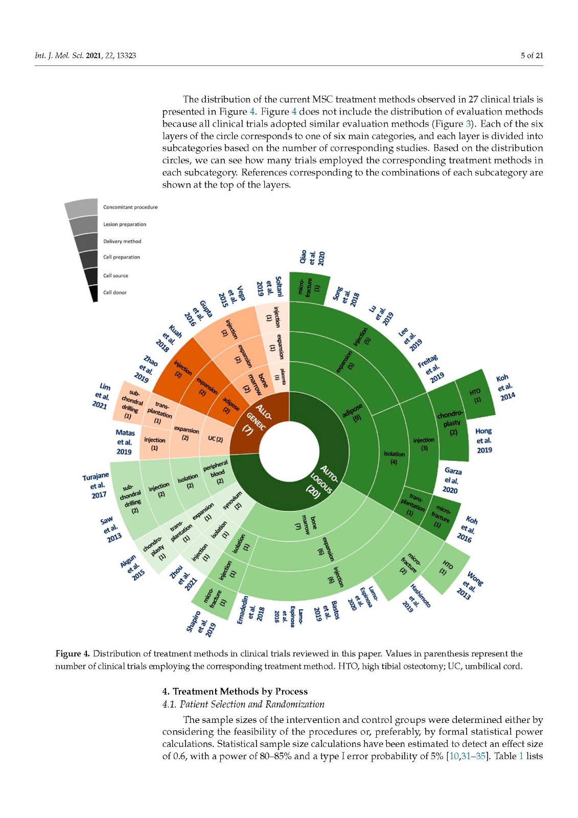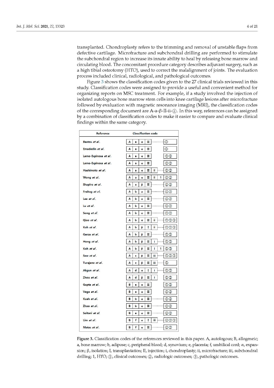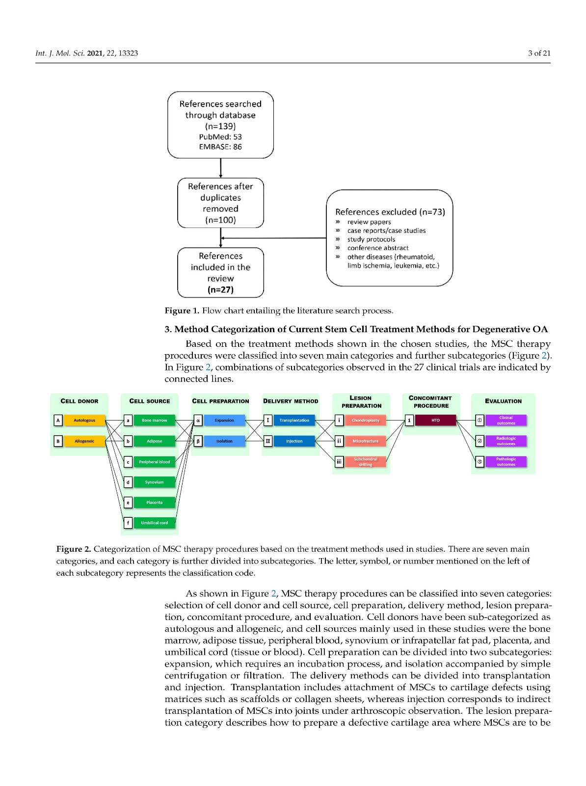 治疗方法可分为七类:细胞供体、细胞来源、细胞制备、递送方法、病变制备、伴随程序和评估。根据这些程序,为每个子类别分配了分类代码。干细胞捐献者分为自体和异体,干细胞来源包括骨髓、脂肪组织、外周血、滑膜、胎盘和脐带。MSCs 是通过细胞扩增或分离过程制备的。它们使用基质附着在软骨缺损处或在关节镜观察下注射到关节中。病变准备类别分为三个子类别:软骨成形术、微骨折和软骨下钻孔。伴随手术类别描述了辅助手术,例如胫骨高位截骨术。